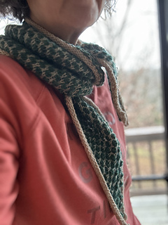 玉編みのように立体的なポップコーン模様を使ったショールです. 同じ太さの糸を2色使って編みます. 3本取りの糸で編む段と1本取りの糸で編む段を2段ずつ交互に編むことで立体的な模様が簡単に出来上がります. 1玉の毛糸から3本の糸を作りながら編み進めるので, 毛糸を3玉用意しなくても3本取りで編むことができます.