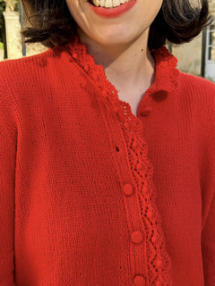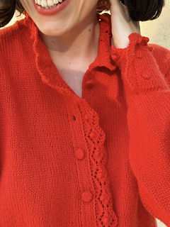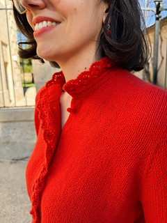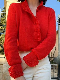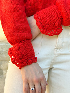 The Poppy Bloom Sweater is a shirt-style inspired sweater featuring a button band and fitted cuffs decorated with an elegant scalloped ruffle. The ruffle (like the sweater) is knitted. The cuffs are fitted to the wrists and fastened with sew on snap. Decorative buttons sewn on the cuffs afterward. This sweater is breastfeeding friendly thanks to its button band. It’s knitted in the round using DK-weight yarn from the top down.