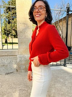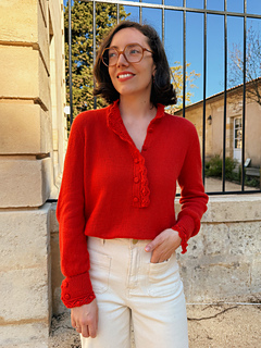 Le Poppy Bloom Sweater est un pull inspiré du style chemise, doté d’une patte de boutonnage et de manchettes ajustées aux poignets, ornées d’un élégant volant festonné. Le volant, comme le reste du pull, est entièrement tricoté. Les manchettes, serrées aux poignets, se ferment à l’aide de boutons-pression, et des boutons décoratifs sont cousus par la suite. Ce modèle est conçu pour faciliter l’allaitement grâce à sa patte de boutonnage. Il se tricote en circulaire, en une seule pièce et de haut en bas, avec un fil de type DK.