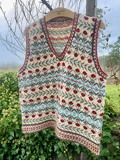 A ladies’ Fair Isle style vest in five sizes using eight colors of fingering weight Jamieson’s of Shetland “Spindrift” Shetland wool yarn, circularly knit in traditional style using steeks, with no reinforcement. This method demands traditional 100% wool yarn, preferably Shetland wool. Superwash wools and non-wool yarns are not suitable for this design, as written.