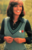 V-Ausschnitt Pullunder, ganz in kraus links gestrickt. Vorder- und Rückenteil in grün-weißen 2-Reihen Streifen. Die schmale Armausschnittblende ist in dunkelblau, und die breite Ausschnittblende in allen drei Farben gearbeitet.