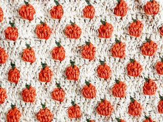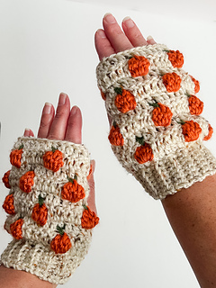 The main body of the gloves are made with the charming Pumpkin Patch crochet stitch, a textured bobble stitch that mimics those bumpy, bountiful gourds without a single appliqué in sight.