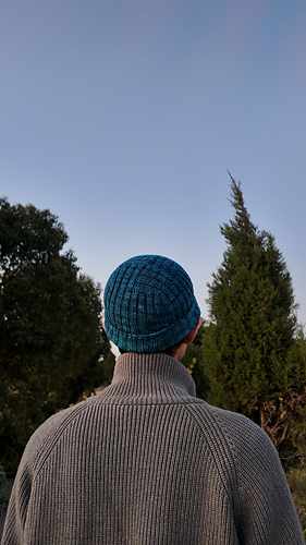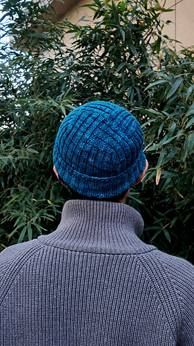 The beanie starts with one section of the crown, then turning to pick up stitches along its side to knit in a perpendicular direction, repeating till the top is complete. The body of the beanie is then worked down from the top in 2x2 rib. It can be tried on during the process to decide where to end the brim.