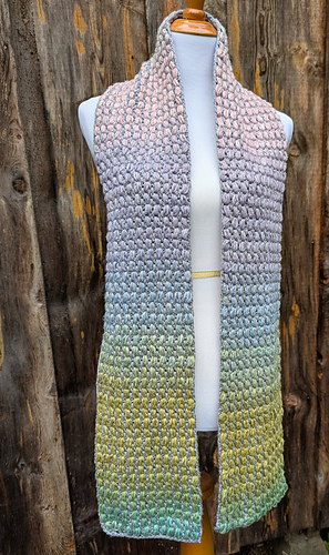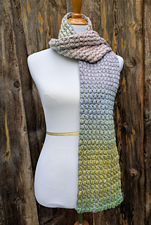 This pattern features self-striping yarn and puff stitches to create a beautiful effect. Pattern is available free on my website or PDF can be purchased here. You’ll need 2 balls of rainbow and 1 ball of solid for the scarf, or 1 of each for the cowl.