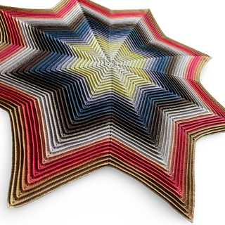 Radiant Star is a blanket with the shape of an eight-pointed star. The pattern is designed so that the blanket easily can be made to any size you want and can be used for both baby blankets and larger throws or afghans. The extra chunky texture of this blanket makes it both warm and beautiful and the pattern includes instructions how to make it with one or multiple colors.