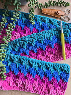 The sample shown has been made using Yarnsmiths Chenille yarn, creating an ultra-soft, plush fabric with a luxurious feel. The chunky yarn works up quickly while producing a beautifully soft and squishy blanket that is perfect for everyday use.