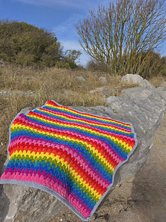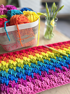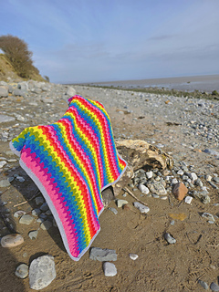 The Rainbow Cuddle Blanket is a cosy crochet blanket designed in a vibrant rainbow colour palette.