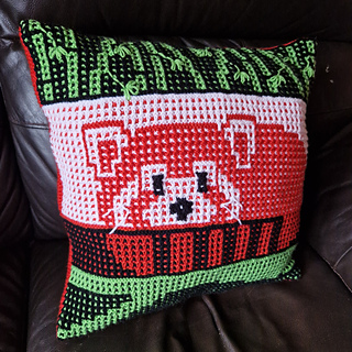 This adorable sleepy red panda cushion is worked flat in one piece, starting and ending with garter stitch. The design is created by integrating mosaic knitting with a small amount of intarsia for the nose and eyes, with some easy embroidery for the whiskers and optional bamboo leaves. The side seams are sewn using mattress stitch and the cushion fastens with 3 buttons.