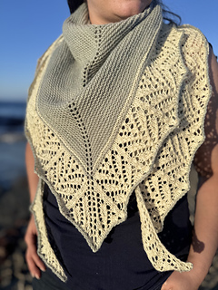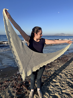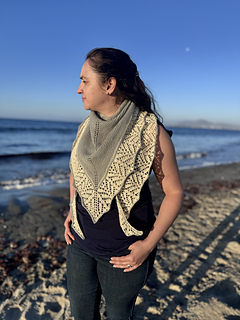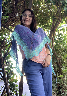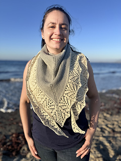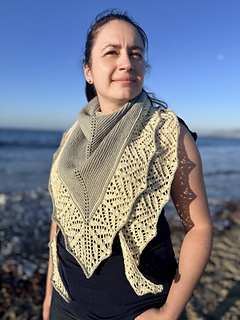 Resplandor es un shawl triangular que celebra la luz plena del verano. Su nombre nace de esos días luminosos, cuando el sol se refleja sobre el mar y todo parece brillar con calma y claridad. Es un diseño pensado para acompañar las tardes largas, los paseos al aire libre y los tejidos sin prisa.