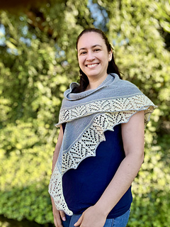La construcción comienza desde el centro del cuello y crece de forma simétrica, combinando una amplia sección de punto bobo que aporta estructura y suavidad, con un calado delicado y expresivo que se despliega en el borde inferior. Este contraste resalta la forma del shawl y permite que el calado luzca especialmente bien al bloquearlo.