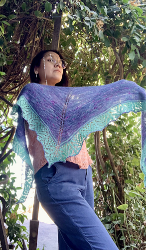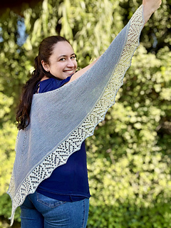 Las medidas finales pueden variar según tensión y bloqueo. El shawl está diseñado para aprovechar el metraje completo del hilado y lograr una caída fluida y generosa.