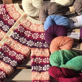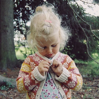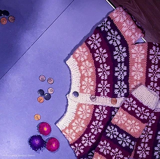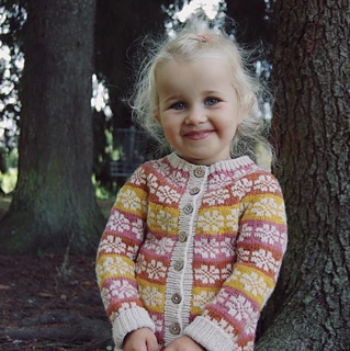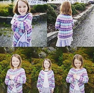 Dette er en fargerik og søt mønstret barnejakke! Jakken strikkes nedenfra og opp, rundt på rundpinne og klippes senere opp foran. Bol og ermer strikkes hver for seg og settes så sammen. Videre er det rundfelling før avslutning rundt halsen.