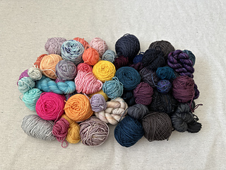 Fingering weight yarns in a variety of colors, 1200 yds/1100 m (approx. 300g) or more, divided into two groups, light and dark. You will need about 10% more dark color yarn than light.