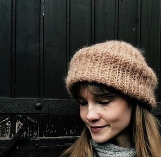Rhuska-hat has a double folded brim to keep you warm during the cold weather. The fabric is really stretchy and fits variety of head sizes. The hat is worked in the round in Fisherman’s Rib from the brim up holding two strands of fingering wt yarn together with one strand of Kidsilk. With a little trick both the folded brim and the hat body show the right side. You can also substitute the fingering yarn with single strand of worsted wt yarn.