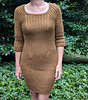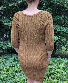 This design is knit from the top down and flat for the beginning of the yoke, then joined and knit in the round. You first work the yoke, which includes a front and back body panel and the beginning of two sleeve panels. When your yoke is long enough to reach your armpits, you separate the sleeve panels from the body panels, holding the sleeve stitches on scrap yarn and joining the body panels to finish the body of the sweater dress or sweater down to the waist. The sweater dress includes waist and hip shaping to give a fitted look. Once you finish the body, you pick up stitches along the cast on edge to knit the collar. You end by working each sleeve individually.