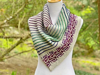 Rogue River is worked on the bias from one end to the other, starting with just 3 stitches, and is only slightly asymmetrical. The I-Cord edges are worked as you go so there’s no finishing to do and the bind off is also I-Cord.