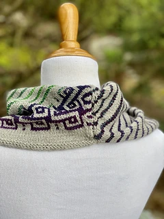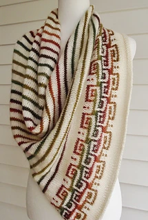 Rogue River is a quick and easy cowl with simple striping and a mosaic band that looks impressive but is really just slipped stitches and uses only one color per row!