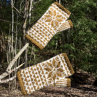 This pattern is for both wristwarmers and fingerless mitts. They feature a Selbu star motif, zigzags, and crosses.