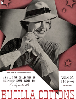 If a lustrous finish is desired, use Bucilla Glossitwist, 2 balls Cream and 1 ball Delft Blue. If a soft, dull (unmercerized) finish is desired, use Bucilla Super Crochet and Knitting Cotton, 1 ball each of Cream and Delft Blue. 1 Bucilla Steel Crochet hook, No. 5, Article 4300. Instructions consist of a mesh triangle, an outer ruffle, an inner ruffle and edging.