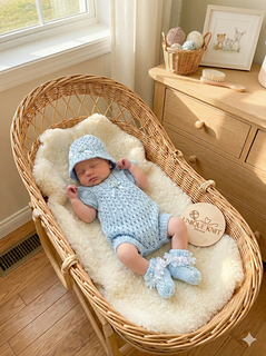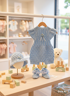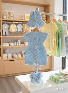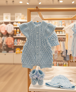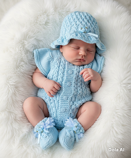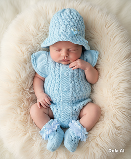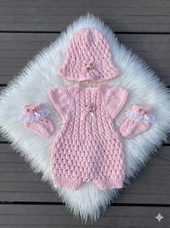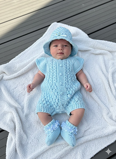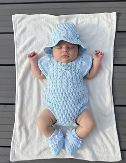 A pretty romper set with a matching bonnet and booties. Knitted on straight needles back and forth with line-by-line instructions. The romper is knitted from the top down, so minimal sewing is needed. It buttons up with 5 buttons on the back but can be worn with the buttons on the front. The sunhat is knitted from the bottom up. The little socks are knitted on two needles back and forth and are also quick to knit up and complete this beautiful little set.