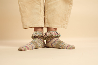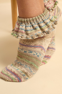 These socks are knit seamlessly from the cuff down, starting with a ruffle and a turned cuff, and feature an afterthought heel.