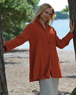 This jacket has the ease of a Japanese kimono, but it is shaped around the shoulders for a more elegant fit. The dramatic cable pattern on the edging at the front is echoed on the cuffs, creating simplicity and drama in one garment.