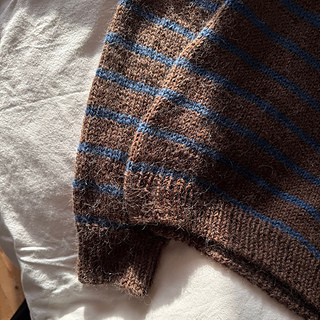 Den brune og blå Saga Sweater er strikket i Drops Nepal i farven mellembrun 0612, og i farven kongeblå 6790.