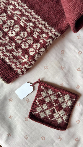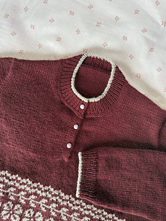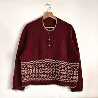 The Sandra Sweater is worked seamlessly from the top down, with European shoulders and contiguous set-in sleeves. It features a band of stranded colorwork around the body with two optional motifs: floral or argyle, and a henley neckline.