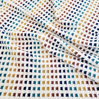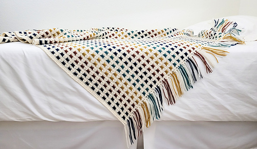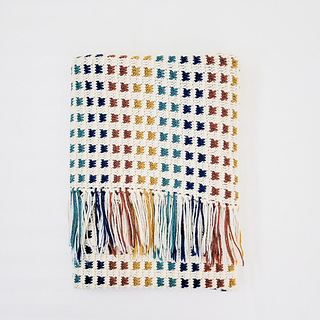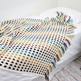 This 60- by 48-inch blanket incorporates a variation of the two-color interlocking block stitch into a unique design that resembles woven fabric. Alternating rows of the main and contrasting colors form a soft grid of dashed stripes, giving the blanket a cozy texture and timeless style.