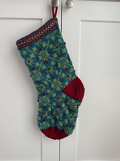 A special stocking worked in Worsted Weight wool on size 6 sixteen inch circular needles. Stranded colorwork, never more than 2 colors in a round. Knit in the round, a triple braid makes up the cuff, a beautiful ocean blue-green background, a bright kiwi green for the nordic all-over pattern, ruby red for the toe and heel. Optional ruby red berries can be overstitched for an extra punch of color. All combine to make a beautiful and festive stocking to grace your fireplace and await St. Nick’s goodies!