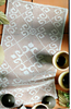Rectangular runner consists of filet crochet scroll designs with a border made up of sc, chain 5 loops and picot stitches.