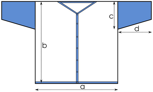a - front/back width 18.5 (22.5, 25.5, 29.5, 34.5)”/ 46 (56, 64, 74, 86) cm