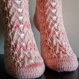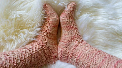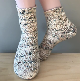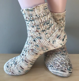 Worked in the round, Secret Garden contains both cuff-down and toe-up written directions and a chart for the pattern stitch. The pattern has instructions for an afterthought heel, but you may substitute whatever heel you enjoy using.