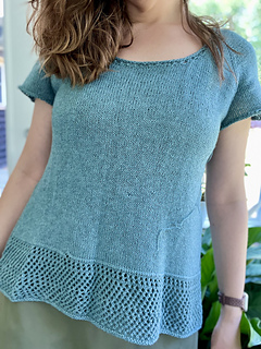 This is a slightly a-lined top with an eyelet lace border at the hem. The longer back is created with short rows for a uniquely stylish look we know you’re going to love. Pair it with colorful jewelry to make a simple and fun spring outfit.