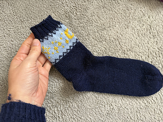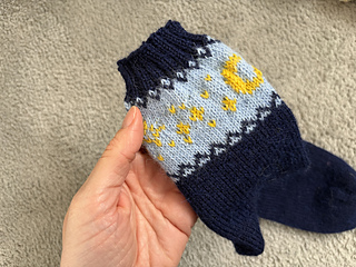 The Selene socks are knitted toe-up. You start with the toe, which is knitted in the traditional way, increasing on each side, and finish with the ankle, which is knitted in ribbing. The ankle is decorated with a moon and stars motif knitted in Fair Isle.