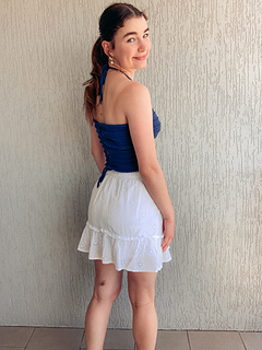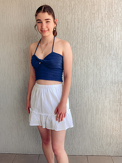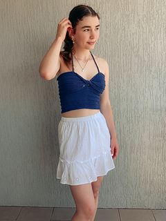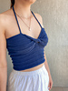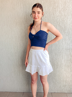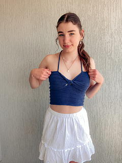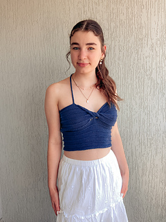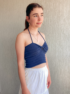 Reminiscent of warm evenings watching the sun set over the water through a light misty rain, this top blends simplicity and elegance. With a modern twist front, simple ridge stitch and negative ease, its the perfect contemporary Summer style. The top is knit flat, a twist is knitted into the work and it laces up at the back with halter straps.