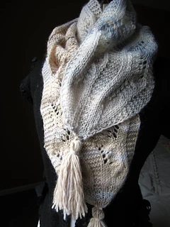 This scarf pattern features unique serpentine shaping along the edges and a subtle lace design in the center, creating a pattern that reminds me of a meandering path. The texture is accomplished with a combination of stockinette and garter stitch and the shaping is accomplished with easy increase and decrease stitches. The ends are pointed and finished with a tassel. Choosing a variegated yarn with subtle color variation and long color repeat produces a very interesting and unique scarf.