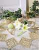 Doily with star-shape fabric center and filet lace square inserts in beige.