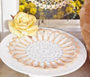 Round doily with white center, leaves all around edged in pink or peach.