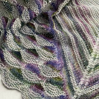 The central body of the shawl is fully written and charted, while the lateral triangles have only the written instructions.
