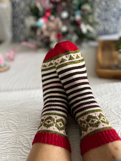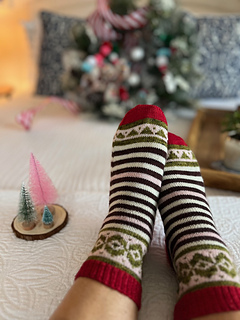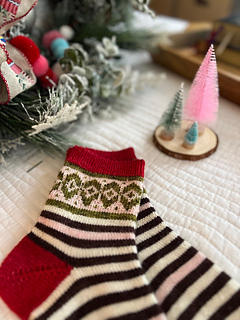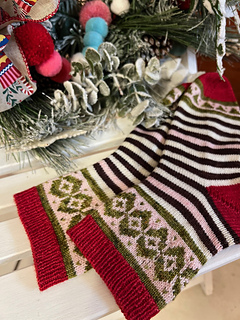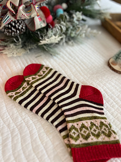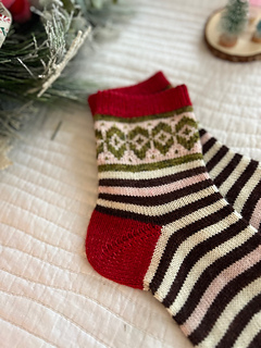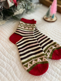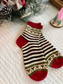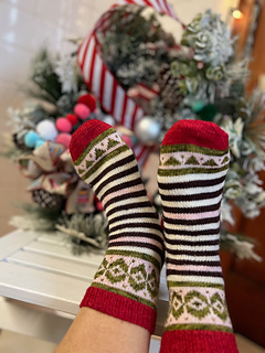 Simple two-color stranded colorwork combines with homey stripes to create a 1950’s vibe complete with a retro color way and patchy toe and heel. These are easy socks worked from the top down that feature a short row heel and wedge toe.