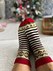 Remember those dazzling ornaments brought down from the attic to decorate Grandma & Grandpa’s tree? They were the ones with tarnished mirror-like surfaces painted Christmas wonderland colors like pink and aqua, red, green, brown and gold. They were formed into fantastical pointy shapes with crinkly, indented middles that caught the light. Those were the Shiny Brites, my favorite ornaments during my childhood Christmases and the inspiration for these whimsical socks.