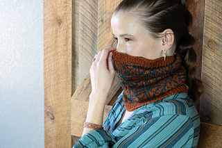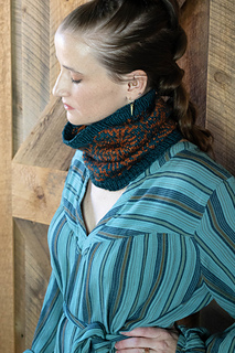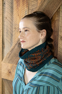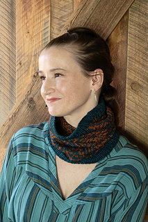 Sample shown in Greenwood Fiberworks’ Yakity Yak DK colorways Aegean and Pumpkin. You can squeeze two cowls out of these two skeins if you are conservative with your swatch; alternate which yarn is the main color for the second one.