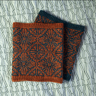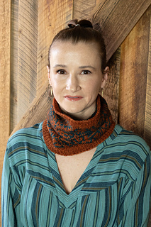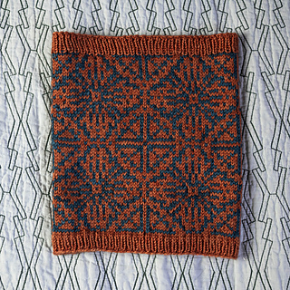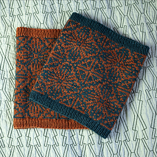 This is a very simple cowl, just a bit of ribbing and Fair Isle stranding. The work is begun at the bottom (or top) with an inch of ribbing. Then the chart is worked twice through. Finally, another inch of ribbing is worked, and the work is bound off stretchy. That’s it!