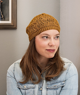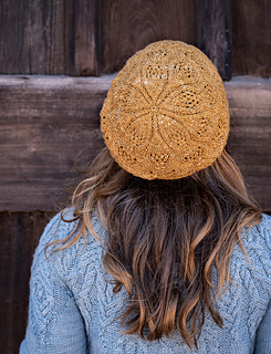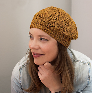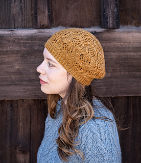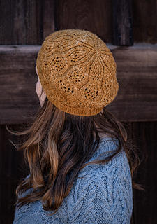 Named after Silvanus, the Roman deity of woods and forests, this beret draws its inspiration from the natural rhythms of trees and leaves. It is worked in an organic lace-and-cables pattern that ripples outward like branches spreading through a canopy, creating a fabric full of movement and lightness.