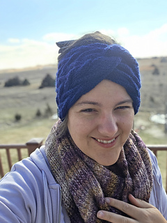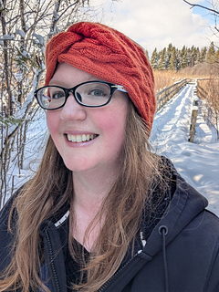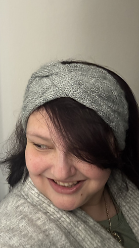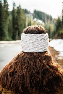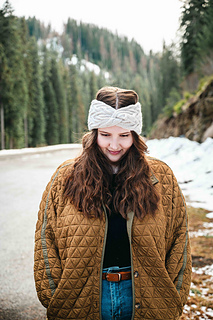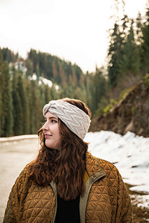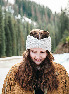 The headband is worked in the round, creating a double-thick, two-sided fabric. Cables are featured on the outside with stockinette stitch on the inside. Both ends are sewn together to create a decorative knot on the right side of the headband.