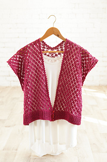 The left and right side pieces are crocheted side to side, then the center back is sewn together. The bottom edge is finished with an easy rib stitch. The armholes and front neckline are finished with picot stitch.