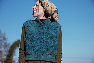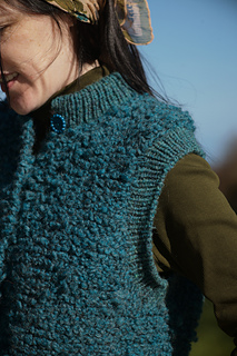 The top-down raglan construction hugs the shoulders with anatomical precision; then sculpts itself, as if by magic, into perfectly rounded armholes. The puffy bodice is finished with finely ribbed edgings and sturdy front closures, providing a cozy cocooning effect without adding bulk or impeding movement. Finally, the origami-like collar can be adjusted in several ways for various degrees of neck and chest coverage.