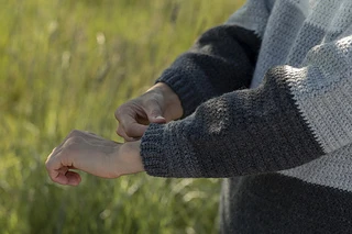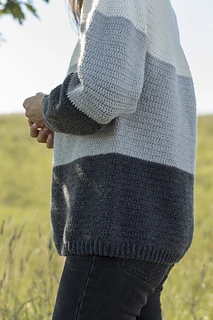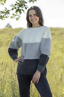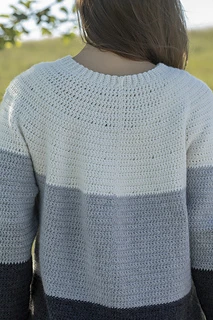 The Snowcap Fade Pullover is a top-down sweater worked in turned rounds. It features short rows at the neck and simple stitches in a faded blocked striped pattern. Ribbing is added to the cuffs and bottom edge of the sweater for a classic look.