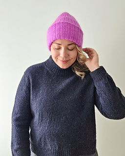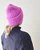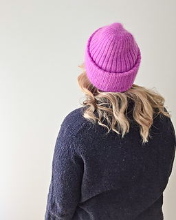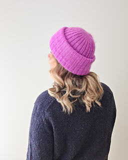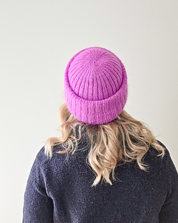 The hat can be knitted either with a single strand of DK weight yarn for a crisp texture or with fingering weight yarn held together with mohair for a soft, haloed finish. In both versions, the simplicity of the ribbing highlights the color and texture of the yarn, whether you keep it subtle with solids or add personality with brighter shades.